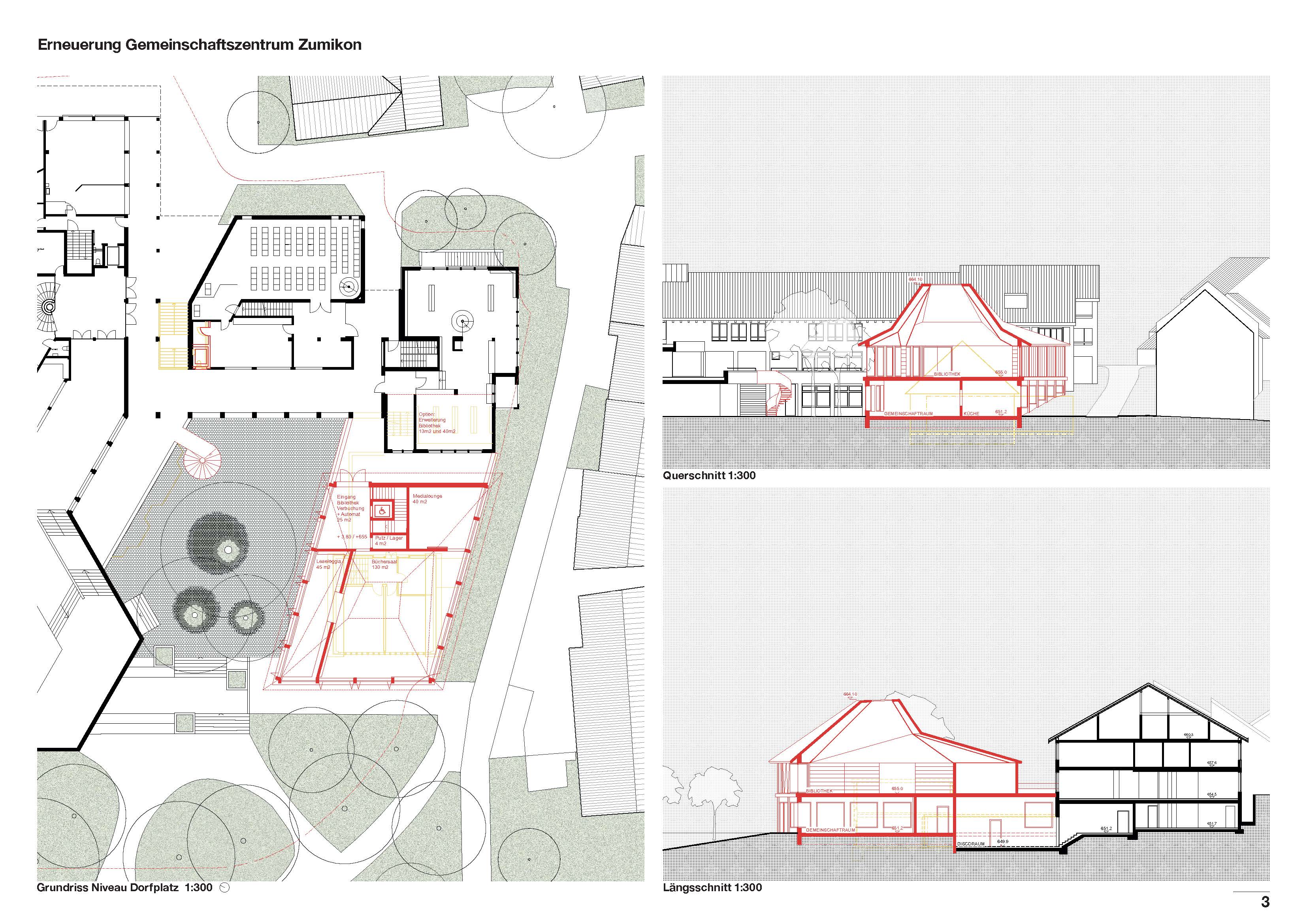 Mit der einfachen kompakten Massstäblichkeit einer «Scheune im Dorf» soll der Anbau als eigenständiger Baustein zwischen der Grossmassstäblichkeit des Gemeinschaftszentrums und der Kleinteiligkeit der angrenzenden Flarzhäuser vermitteln. Ähnlich einer «Scheune» soll das neue Volumen mit einer intelligenten Hülle flexible Nutzungsszenarien ermöglichen. Architektonisch formuliert der neue Bibliotheksraum durch eine Holzdachkonstruktion eine spezifische Innenraumatmosphäre und erweitert die Vielfalt der bestehenden Räume um ein weiteres „Filetstück“ wie den grosser Gemeindesaal, der Kirchgemeindesaal und die Kapelle.